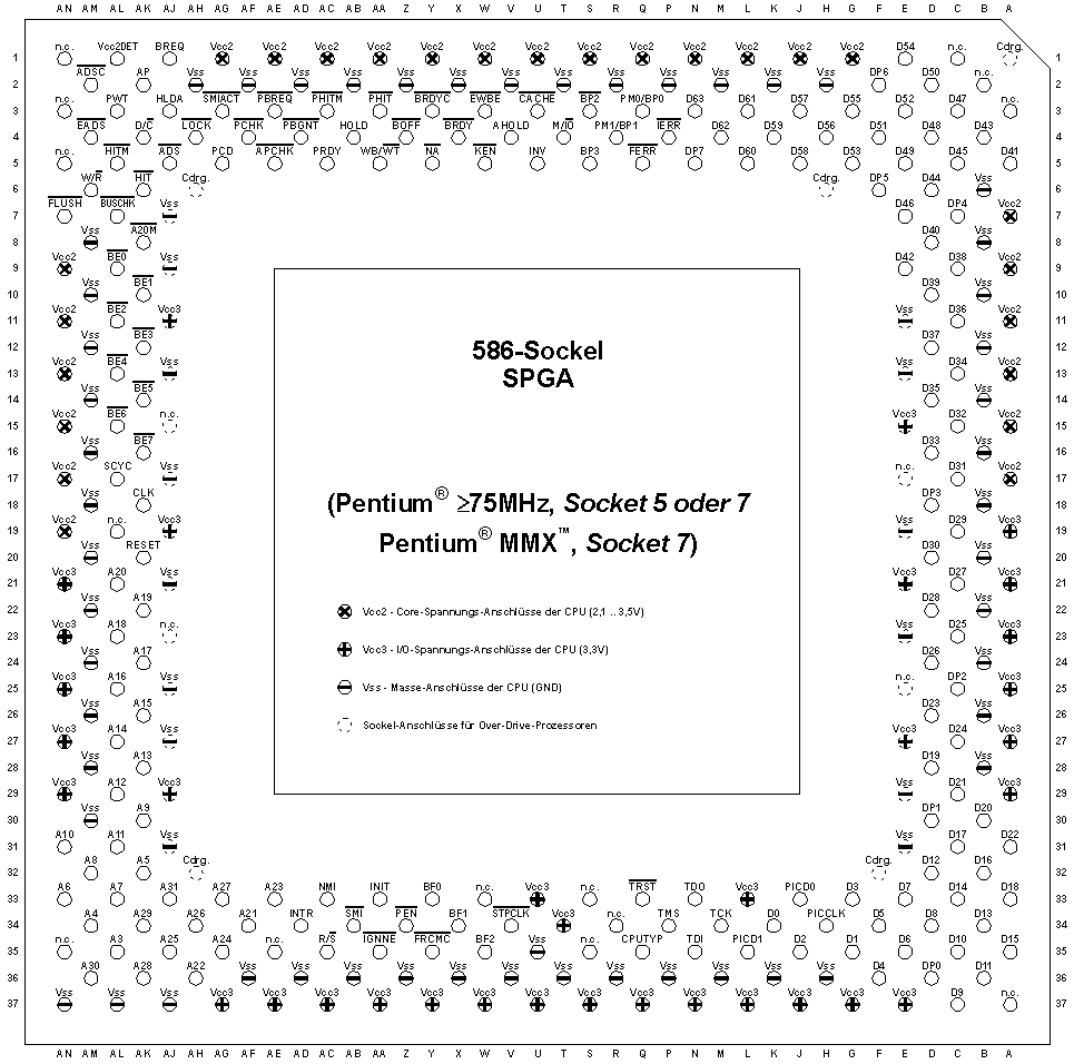 | CPU-Pinout Pentium® ab 75MHz ("Socket 5 / 7") bzw. ab MMXtm ("Socket 7") - (SPGA-320 [Socket] / SPGA-296 [Prozessor]) |