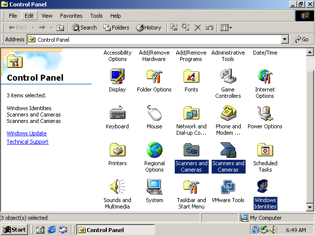 Die Systemsteuerung bietet 3 neue Optionen, 2 mal "Scanners and Cameras", das erste ist ein Ordner mit allen angeschlossenen Scannern und Kameras, das zweite bietet Optionen, um solche Geräte zu installieren, beide stammen aus Windows ME Betas. Das letzte, "Windows Identities" ist ein neuer Benutzermanager, basierend auf HTML mit Javascript, dass per MSHTA aufgerufen wird..