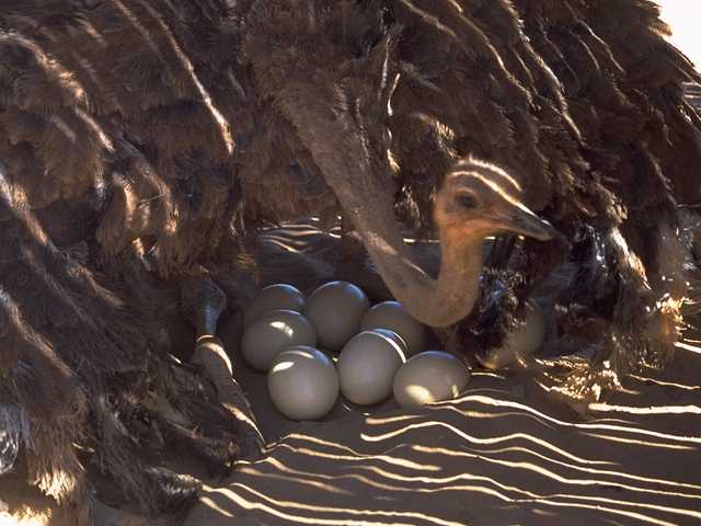 Straußenweibchen auf Gelege