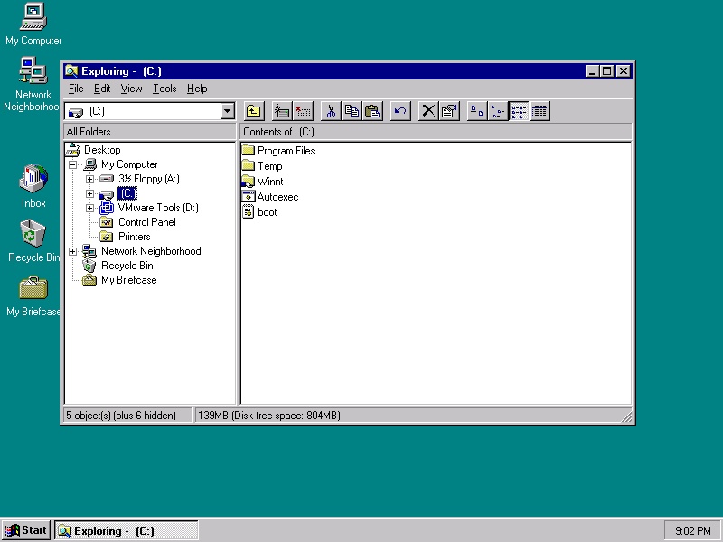 Der Windows NT-Explorer heißt hier bei geöffnetem Fenster Exploring und nicht Explorer, sieht aber auch hier schon sehr wie der fertige Windows NT-Explorer aus, auch alle Funktionen arbeiten schon so wie gewohnt. Mit der Beta 2 ist Windows NT nicht mehr weit von der fertigen 1381-Build und damit fast fertig.