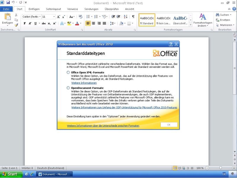 Office 2010 erschien im Frühjahr 2010 und ist damit der Nachfolger des fast 3 Jahre alten revolutionären Office 2007. Die dort eingebauten Neuerungen in Form des Ribbon-Interfaces wurden in Office 2010 erweitert und auch in bisher unberührte Programme wie Visio und Outlook eingeführt. Die Anforderungen an den Computer sind gegenüber Office 2010 kaum höher, lediglich Windows XP Nutzer müssen das Service Pack 3 installieren, um in den Genuss der neuen Version zu kommen. Weggefallen hingegen ist die bisherige Variante der Volumenlizenzen. Auch diese müssen jetzt bei Microsoft aktiviert werden. So wie bei Windows Vista und Windows 7. Weggefallen ist bei Office 2010 wieder der Office-Button, ein Revival des Menüs Datei gibt es in allen Office 2010-Produkten. Hinweis: Die Starter-Editionen verlangen mindestens Vista mit SP1 und damit haben diese kein Windows XP-Support mehr. Neu ist dagegen, dass beim ersten Start gefragt wird, ob man denn die Dateien standardmäßig als Office oder als OpenOffice-Dokument speichern möchte.