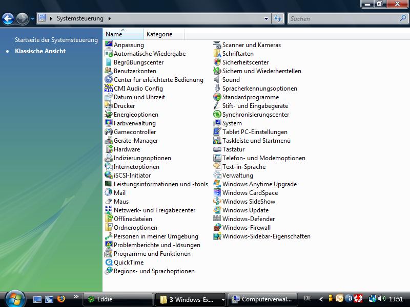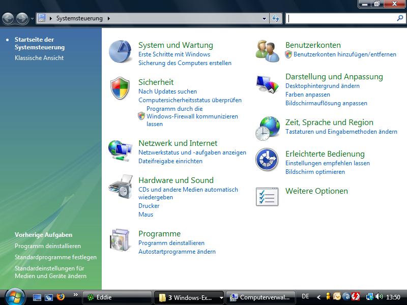 Die Systemsteuerung hat auch eine Grafische Überarbeitung erfahren, wie bei XP ist alles in Kategorien eingeteilt, man kann aber zur alten Ansicht wechseln.