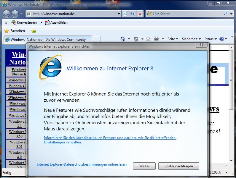 | Nach der Installation gibt es erstmal Schnelleinstellungen und dieses Willkommen zu IE8-Fenster |