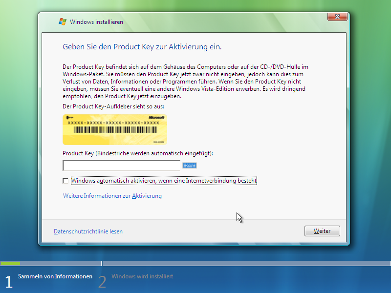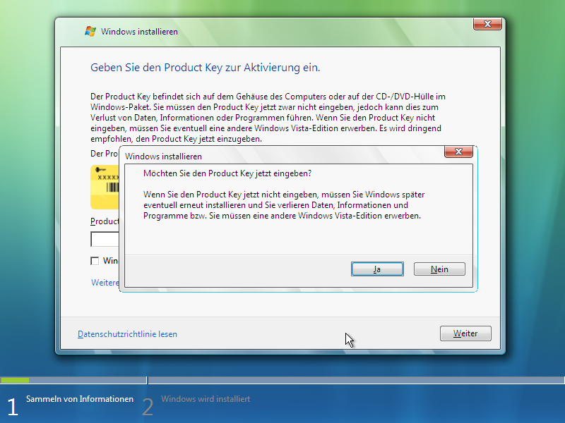 Dann möchte das Vista-Setup gerne den Key zur Aktivierung haben, aber auch ohne Key kann man Vista 30 Tage lang testen.