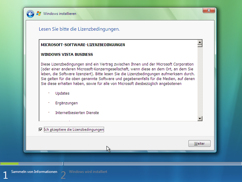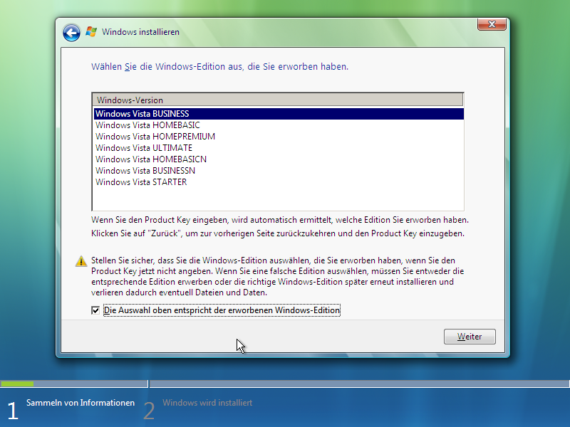 | Und weiter gehts, Auswahl der Vista-Edition, alle Editionen sind installierbar! |