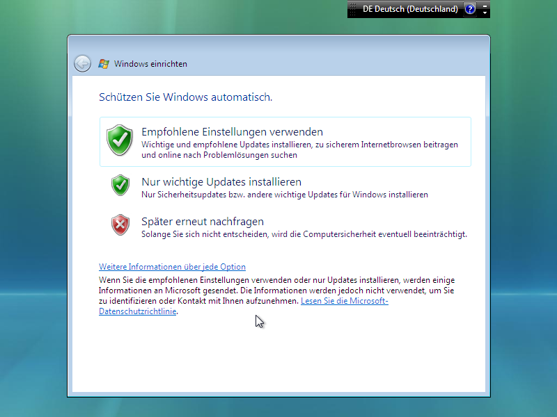Als nächstes möchte Vista sein Sicherheitscenter aktiviert bekommen und die empfohlenen Einstellungen haben.