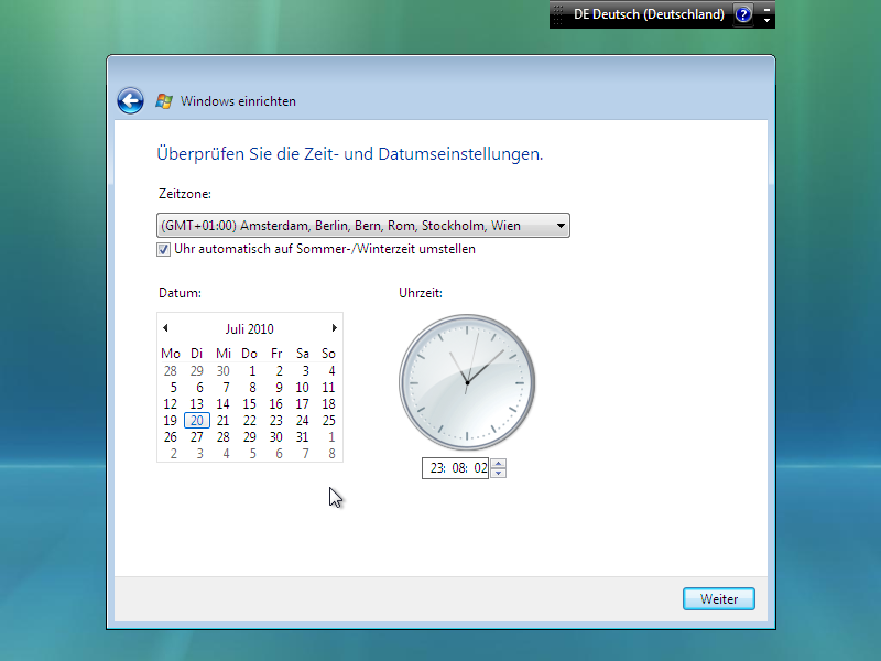 Danach muss noch die Zeitzone und Uhrzeit eingestellt werden, die für Vista gelten soll.
