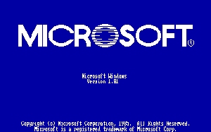 Windows 1.0 sollte im Jahr 1984 erscheinen, aber die Testphase verzögerte sich immer weiter, so dass Windows 1.0 erst im Jahr 1985 erschien, als Windows 1.01. Der Boot-Bildschirm war noch in blau-weiß und mit altem Microsoft-Logo. Ziele für Windows waren: Unabhängige Speicherverwaltung, ausführen von DOS-Programmen unter Windows, ein Durchbrechen der 640KB-Speichergrenze und vieles mehr. Microsoft hatte sich damit aber auch viel Ärger eingebrockt. Denn auf den damaligen 8086 und 80286-Prozessoren lief das ganze doch sehr langsam ab.