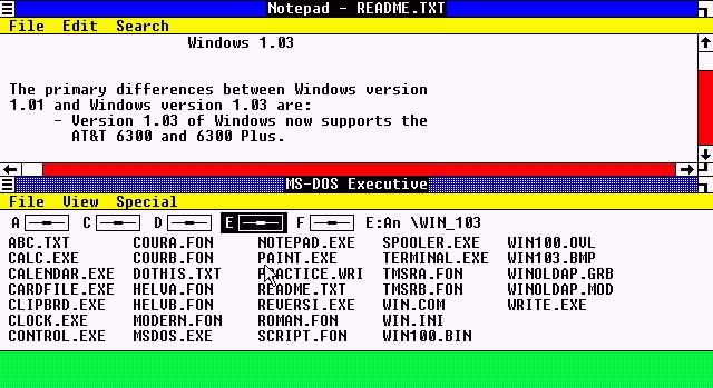 Englisches Windows 1.03 mit geteiltem Bildschirm durch Notepad und MS-DOS Excecutive:
