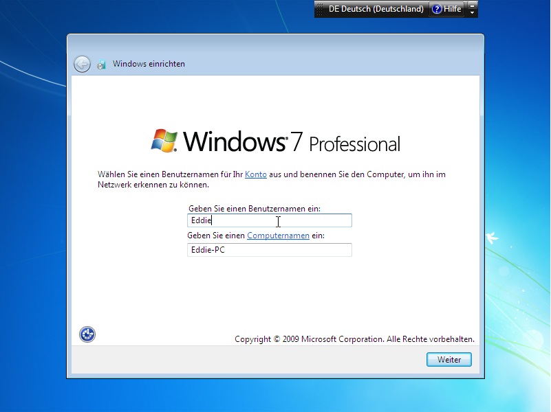 Danach wird die eigentliche Installation abgeschlossen und die Anpassung an Benutzer und PC findet statt: