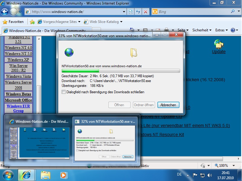Neu ist auch das sogenannte Aero Peek. Wird z.B. im neuesten Firefox oder Internet Explorer eine Datei heruntergeladen, kann man anfand eines leicht grünen Fortschrittsbalkens genau sehen, wie weit dieser schon fortgeschritten ist. Hält man die Maus auf das IE-Symbol, sieht man dann den DL-Dialog im genauen.