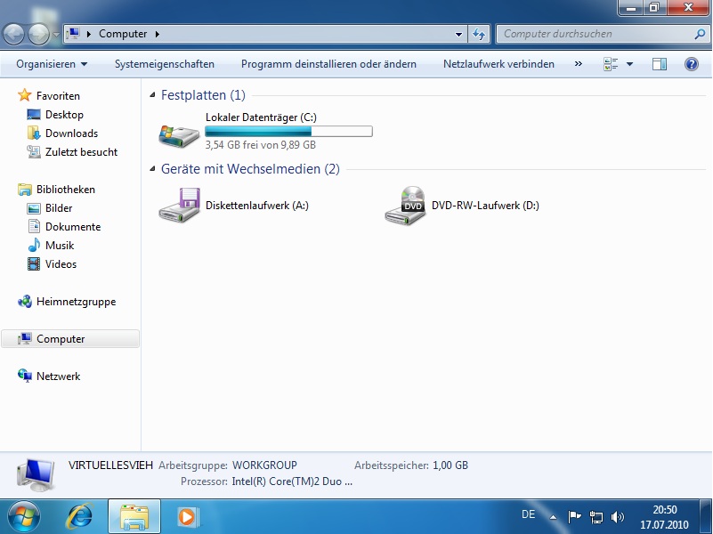 Der Arbeitsplatz hat gegenüber Windows Vista kaum Änderungen erfahren, nur sind auch hier die Bibliotheken an der rechten Seite zu erkennen, die einem die Arbeit einfacher machen sollen.