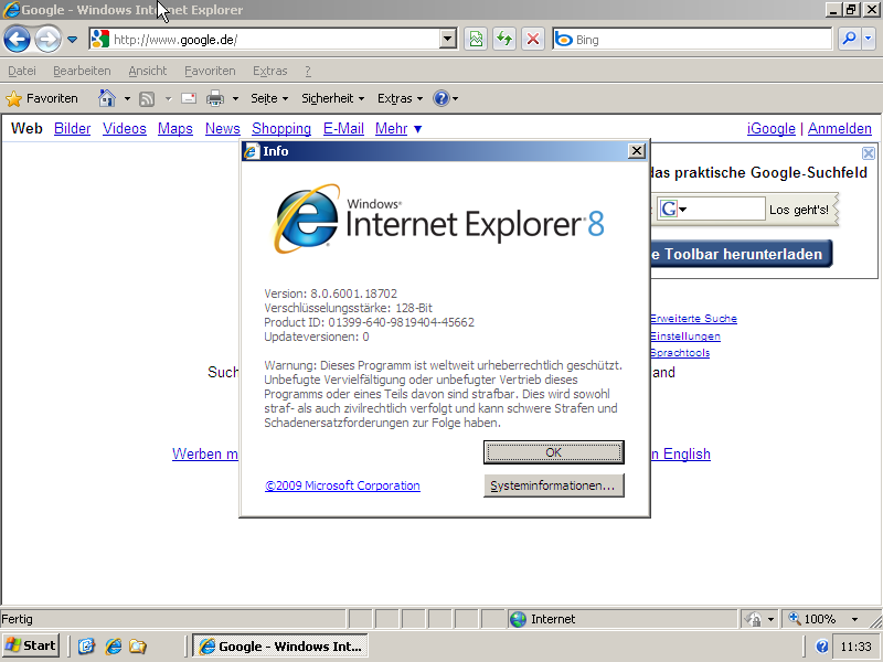 | Der Internet Explorer 8.0 unter einem Windows Server 2003-System |