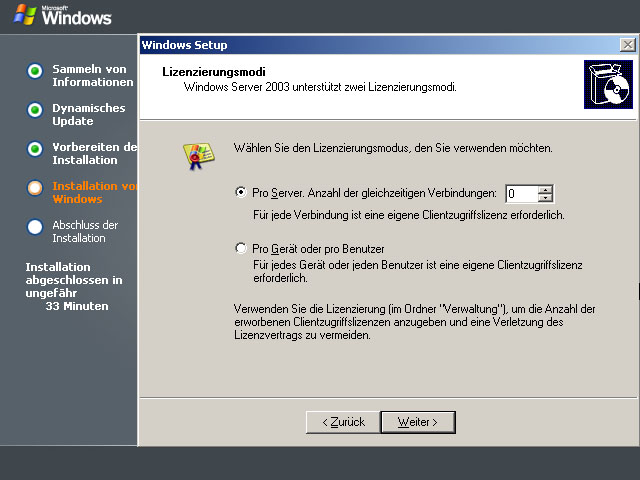 Danach folgt die Auswahl eines Lizenzmodus für Windows Server. 2 Stück werden dabei unterstützt. Pro Server oder Pro Gerät, bei Server muss die Anzahl der gleichzeitigen Verbindungen eingegeben werden. Wie in Windows NT Server 5.0 muss für jede Verbindung extra gezahlt werden.