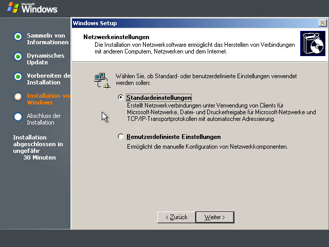 Wurde auch hier auf "weiter" geklickt wird das Netzwerk so wie in XP installiert und man kann zwischen Standard und benutzerdefiniert auswählen. Meistens wählt man Standard, wenn man von Protokollen nicht sehr viel Ahnung hat :-)