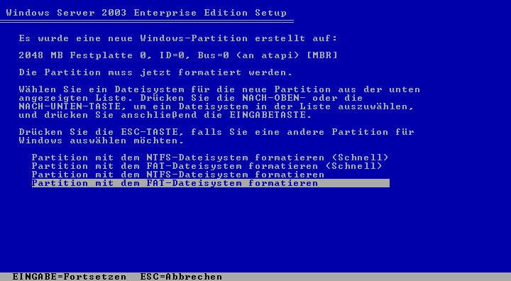 Wenn die Eingabetaste gedrückt wurde, fordert Sie Windows dazu auf eine Partition/Festplatte für die Installation auszuwählen und ob diese im FAT oder NTFS-Dateisystem formatiert werden soll. Wenn bereits eine Partition eingerichtet worden ist, kann das Dateisystem auch so gelassen werden.