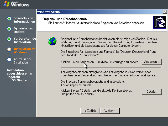 Wie in XP folgt nach der Geräteinstallation die Überprüfung der Region und der Sprache. Meistens muss nur das amerikanische Tastaturlayout entfernt werden. Im Gegensatz zu XP ist der standard und DM nicht mehr vorhanden, da es ja die erste Version von Windows ist, die nach 2002 erschien.