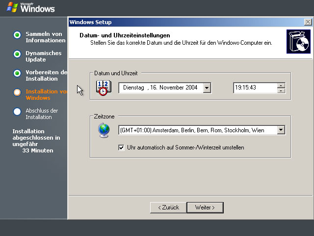 Als nächstes fordert das Setup-Programm wieder Uhrzeit und Zeitzonen-Einstellungen, wie immer sollten Deutsche GMT + 01:00 (Berlin) wählen, damit auch die Sommerzeit richtig eingestellt wird.