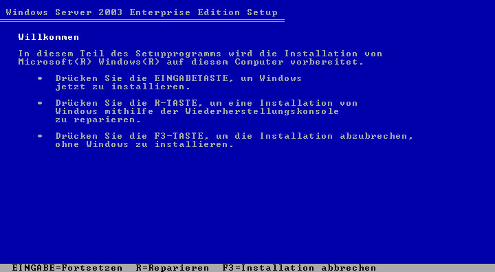 Windows Server 2003 lässt sich wie Windows XP Professional von 98, ME, NT 4.0, NT 5.0 installieren. Die Update-Funktion hingegen funktioniert nur von bestehenden Server-Betriebssystemen und nicht von normalen Workstation-Versionen, dafür ist Server 2003 auch nicht gedacht. Nachdem man per Boot-CD (hier vorgestellt) oder winnt(32).exe das Setup startet kommt früher oder später der Willkommensbildschirm von Windows Setup.
