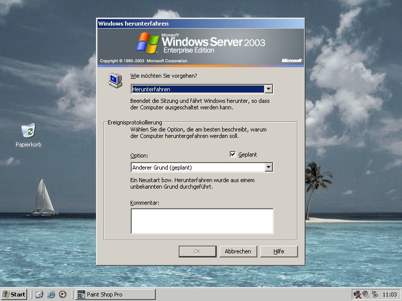 Windows Server 2003 fährt auch nicht einfach so herunter, entweder muss ein vorgegebender Grund fürs Herunterfahren gewählt werden oder ein eigener Grund gewählt werden. Server werden ja normalerweise Monate lang laufen gelassen und werden nicht oft neugestartet.