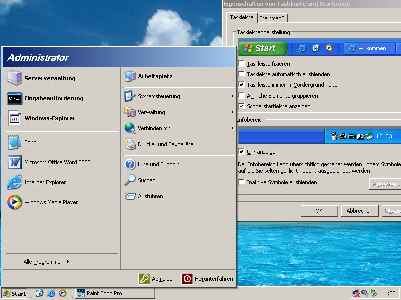 In Windows 2003 ist zwar das neue Design deaktiviert, aber das neue Startmenü aktiviert, herauskommt eine ziemlich verrückt aussehende Mischung, die schnellstmöglich verändert werden soll. Die Bilder in den Eigenschaften der Taskleiste wurden hingegen nicht verändert und wurden von Windows XP übernommen.