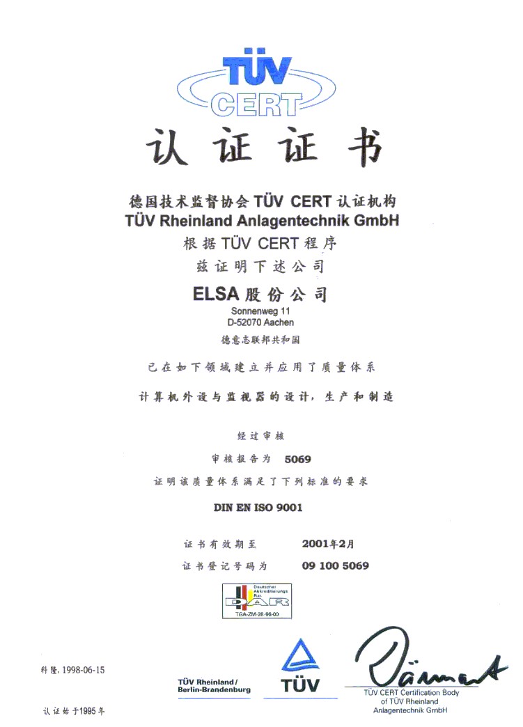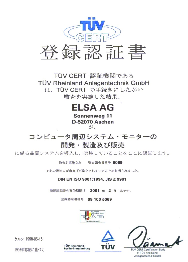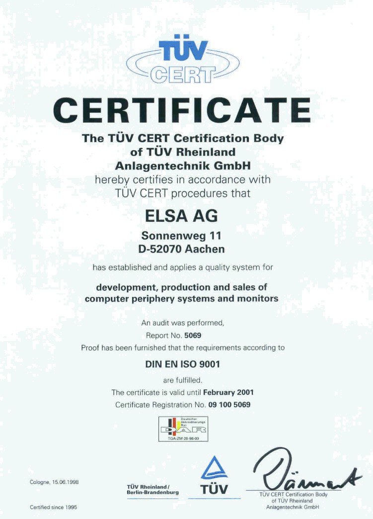 Since 1995, ELSA is DIN EN ISO 9001 certified by the German quality assurance association TÜV Rheinland. To see or download the latest certification document(s), select from the list below: