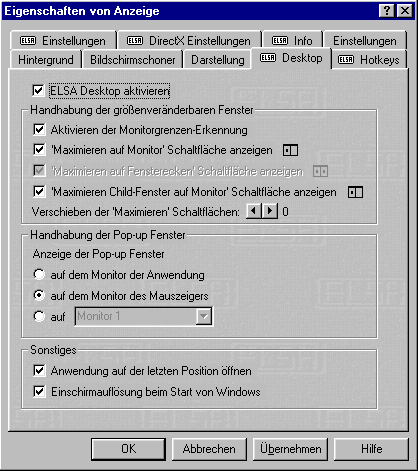 Das Handling ist auch bei mehreren Applikationen und deren Zuordnung auf die einzelnen Monitore für den Anwender denkbar einfach. Die Bedienung erfolgt ganz intuitiv über Zusatz-Buttons, die automatisch in die Windows-Programme implementiert werden. Unter "Eigenschaften von Anzeige" können im Register "ELSA-Desktop" die Zuordnung der Funktionen einfach auf die eigenen Anforderungen angepaßt werden.