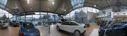 DRITTENS: Für einzelne Bilder kann der IBR-Algorithmus den gewählten Ausschnitt wieder entzerren. Bei interaktiven Präsentation sieht der Betrachter am Computermonitor einen rechteckigen Ausschnitt aus dem Gesamtpanorama und kann sich durch Mausbewegungen darin "bewegen". (Das folgende Beispiel stammt vom Architektur-Büro Pleiß und Dienberg und wurde mit PhotoVista von MGI Software erstellt):