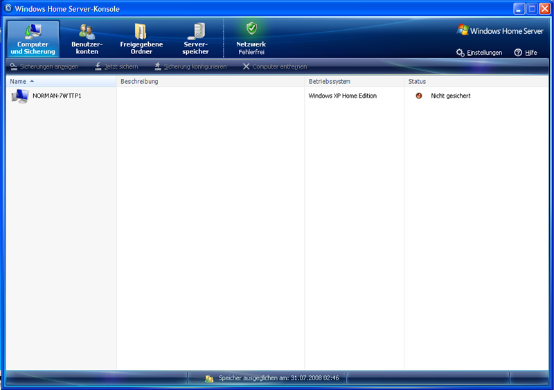 Die Home Server Konsole: Um anderen Zugriff zu gewähren muss man Benutzerkonten erstellen, man kann direkt einstellen, auf welche Ordner man Zugriff hat und auf welche nicht. Der Reiter "Computer und Sicherung" sichert auf Wunsch automatisch alle Daten, die im Netzwerk vorhanden sind. "Freigegebene Ordner" zeigt alle Ordner, die für die Netzwerkbenutzer freigegeben sind, man kann aber noch weiter einstellen, so dass z.B. nur ein User Account auf einen bestimmten Ordner zugriff hat.