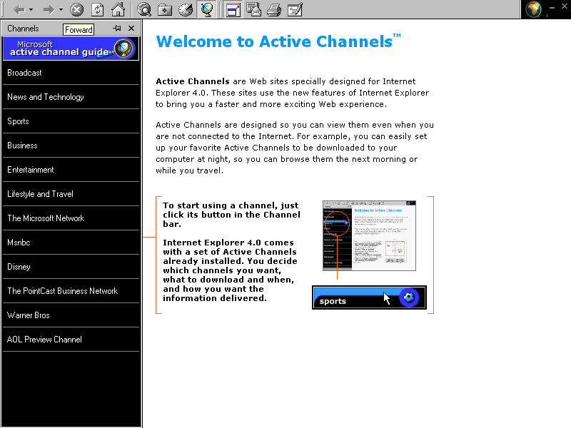 Zum Internet Explorer gehörten damals die "Active Channels", sie sollten neue Wege und Möglichkeiten des Internet Explorers zeigen und Schnellzugriff auf Funktionen bieten, alles in allem ein grausames Konzept!