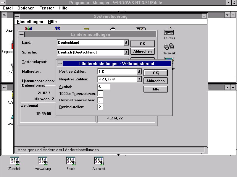 € UpdateDownload (1,4MB)Dieses Setup ermöglicht die Eingabe vom € Zeichen in Windows NT 3.51 und die Anzeige des € Symbols Bitte Beachten: Vorher das SP5 installieren sonst kann es zu Problemen kommen. ![]() Bild 1 - Euroupdate in den Spracheinstellungen |