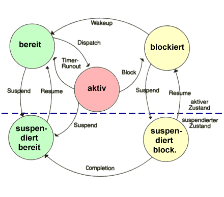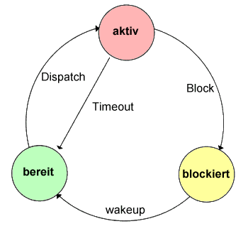 - blockiert: Prozeß wartet auf das Eintreten eines bestimmten Ereignisses