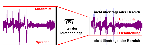 Es stellt sich nun die Frage, wie hoch sich die Datenrate bei der Telefonleitung schrauben läßt. Die Telefonverbindung hat einen zulässigen Frequenzbereich von 300 Hz bis 3400 Hz. Bedingt durch die Dämpfung lassen sich maximal nur etwa 2500 Hz nutzen. Die maximale Baudrate beträgt das Zweifache der Grenzfrequenz, also 5000 Baud.
