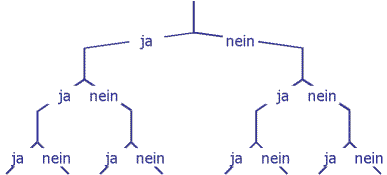 Der Informationsgehalt einer Nachricht ist also feststellbar und wird durch die Anzahl der (rechts-links) Entscheidungen bestimmt und wird in "bit" gemessen. 1 bit entspricht dabei einer Entscheidung: