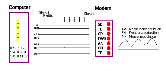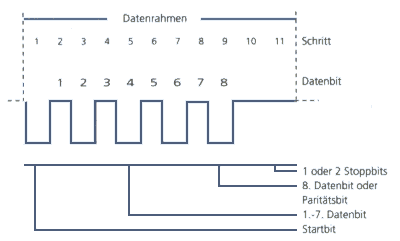 Da der Computer die Daten parallel verarbeitet, braucht er für die Ausgabe zunächst eine sogenannte "serielle Schnittstelle", die ein Byte Bit für Bit seriell ausgibt. So wird beispielsweise der Buchstabe "A", der im Computer in der Form des zugehörigen ASCII-Codes als Zahlenwert 65 gespeichert ist, als Folge der acht Bits 01000001 übertragen. Jedem Zeichen wird noch ein Startbit vorangestelt, das immer den Wert 0 hat. Da die Leitung im Ruhezustand immer auf 1 liegt, kann der Empfangsbaustein erkennen, wann ein Zeichen ankommt. Nach den Datenbits kann dann noch ein Prüfbit (Parity) folgen. Zum Schluß folgen dann noch 1 oder 2 Stoppbits, die immer auf 1 liegen und so eine Trennung zum nächsten Startbit bilden.