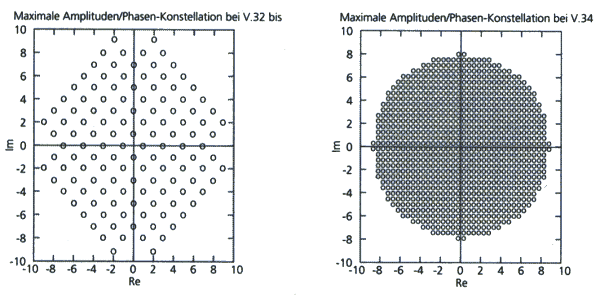 | ITU-Empfehlung | maximale Schrittgeschw. (Baud) | maximale Bitrate (bps) | Modulations Verfahren |