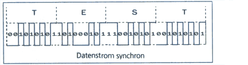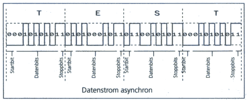 Eine Zeichenfolge besteht dann aus einer Folge von Datenbits, die für jedes Zeichen von Start- und Stoppbit eingerahmt werden. Zwischen zwei aufeinanderfolgenden Zeichen können sich auch beliebig lange Pausen befinden, da der Beginn eines Zeichens am Startbit eindeutig erkannt wird. Daher nennt man diese Form der Übertragung "asynchron".