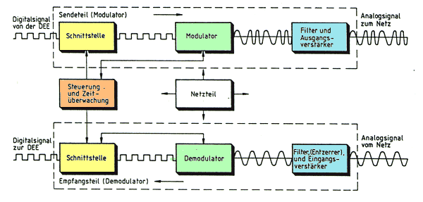 Bei den Geräten der ersten Generation wurde der Telefonhörer auf einen "Akustikkoppler" mit Lautsprecher und Mikrophon aufgelegt. Dieser "pfiff" auf diese Weise die Daten in die Telefonleitung. Am anderen Ende der Leitung wurden dann die Tonsignale demoduliert und in digitale Informationen umgewandelt. Man kann sich natürlich den akustischen Umweg sparen und die Signale direkt in die Telefonleitung einspeisen, was heute die Regel ist. Das folgende Bild zeigt den schematischen Aufbau eines Modems.