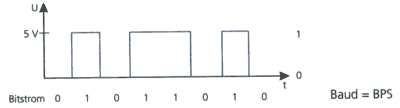 Die Schrittgeschwindigkeit ist 1/T. Ihre Einheit ist baud=1/s. (benannt nach dem Franzosen E. Baudot), die aus der Fernschreibtechnik stammt. In baud wird also die Anzahl der Informationsänderungen pro Sekunde angegeben. Dazu ein Beispiel: Wir definieren für unsere Übertragungsstrecke (in diesem Fall soll es ein einfaches Kabel sein) zwei binäre Zustände 0 und 1. Die 0 soll einer Spannung von 0 Volt entsprechen, die 1 einer Spannung von 5 V. Hier ist die Baudrate gleich der Anzahl der übertragenen Bits/Sekunde.