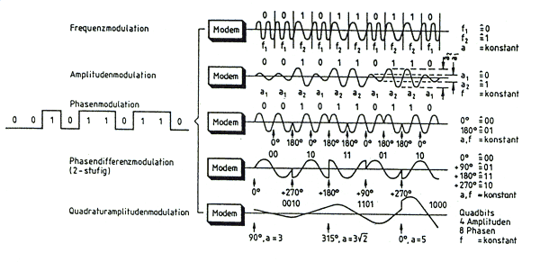 Bei der Übertragung per (analoger) Telefonleitung oder per Funk kann man die Basisband-Übertragung nicht verwenden. Die Binärwerte werden in diesem Fall einem höherfrequenten Signal (Sinusträger) aufmoduliert. Dazu ist ein Modem (Modulator-Demodulator) notwendig. Im einfachsten Fall verwandelt ein Modem den seriellen Bitstrom beispielsweise in Töne unterschiedlicher Höhe, für die "0" einen tieferen Ton und für die "1" einen höheren Ton (Modem = DÜE = Datenübertragungseinrichtung; der Computer wird DEE = Datenendeinrichtung genannt).