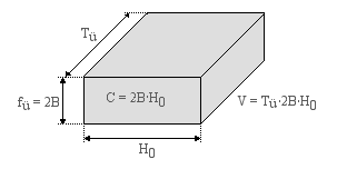 Die Kanalkapazität dazu wird in Formel 2 oben angegeben (Einheit Bit/s). Innerhalb der Übertragungszeit T0 kann der maximale Gesamtinformationsgehalt Hmax gemäß Formel 3 übertragen werden. Dieses Produkt lässt sich als Volumen eines Quaders darstellen, dessen Kantenlängen durch die genannten drei Kenngrößen bestimmt werden.