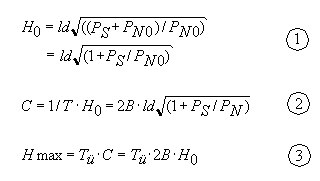Im Fall der Überlagerung von Signal (Leistung Ps) und Rauschen (Leistung PN0) gilt als Entscheidungsgehalt H0 eines einzelnen Augenblickswertes in Bit (Formel 1)