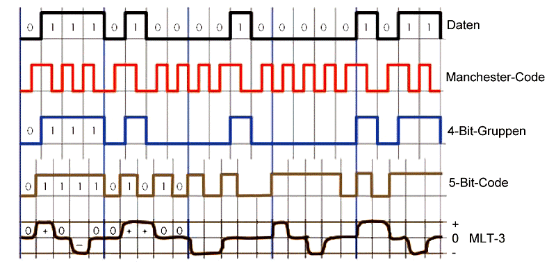 Dies leistet zum Beispiel bei FDDI die 4B/5B-Umwandlung (4 binary 5 binary), bei der jeweils