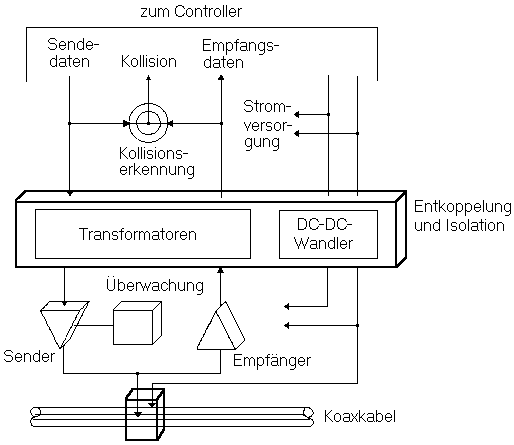 Das Ethernet besteht physikalisch aus verschiedenen Typen von 50-Ohm-Koaxkabeln oder paarweise verdrillten Leitungen (Twisted-Pair), Glasfasern, oder anderen Medien (siehe nächsten Abschnitt). Die Datenrate beträgt typisch 100 MBit/s (früher 10 MBit/s, 1000 MBit/s läuft an). Die wichtigsten Eigenschaften nach der ursprünglichen Spezifikation sind: