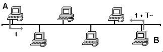 Nehmen wir nun an, daß zwei Stationen A und B, die sich an gegenüberliegenden Enden des Kabelsegments befinden. Die Station A sendet zum Zeitpunkt t ein Datenpaket ab. Die Station B sendet ihrerseits zum Zeitpunkt t + (T - dt), also kurz bevor das Signal von A bei B ankommt. Damit A die Kollision erkennen kann, vergeht nochmals die Zeit (T - dt), also insgesamt t + 2*(T - dt).