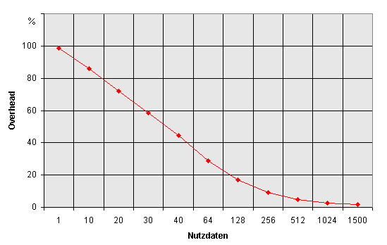 Im folgenden Diagramm ist der prozentuale Overhead gegen die Nutzdaten-Bytes aufgetragen.