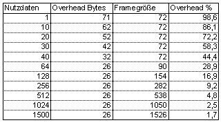 Nicht verkleinern läßt sich jedoch der Overhead, der durch die Verwaltungsinformation im Ethernet-Frame (Adressen, Control-Info) entsteht. Der Overhead wird umso kleiner, je größer der Nutzdatenanteil ist. Die folgende Tabelle zeigt die Abhängigkeit von Overhead und Nutzdaten (berechnet):