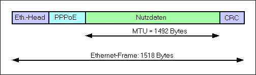Beim Internetzugang via DSL kommt auf der Verbindung zum DSL-Modem häufig das Protokoll PPPoE (Point-to-Point-Protocol over Ethernet) zum Einsatz. PPPoE beansprucht in jedem Frame zusätzlich 8 Bytes zur Übertragung von Verbindungsinformationen. Die MTU reduziert sich daher bei der Verwendung von PPPoE von 1500 auf 1492 Bytes.
