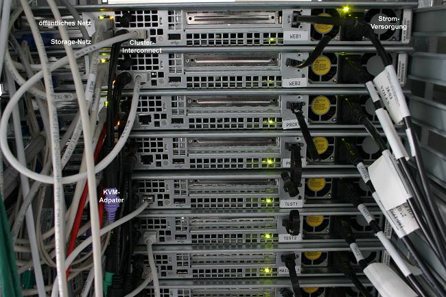Das Bild rechts zeigt den Blick von hinten auf die Server im Schrank. Die