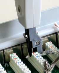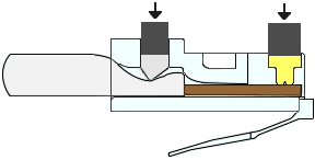 Liegt die Kabelader im Schlitz der Leiste wird das Auflegewerkzeug aufgesetzt und nach unten gedrückt. Mit diesem Vorgang wird die Kabelader abisoliert und die Kuferlitze in einen V-förmigen Schlitz aus Metall gepreßt, wo eine innige Verbindung zwischen Litzte und Metallkontakt hergestellt wird. Gleichzeitig schneidet das Werkzeug das überstehende Ende der Litze ab.